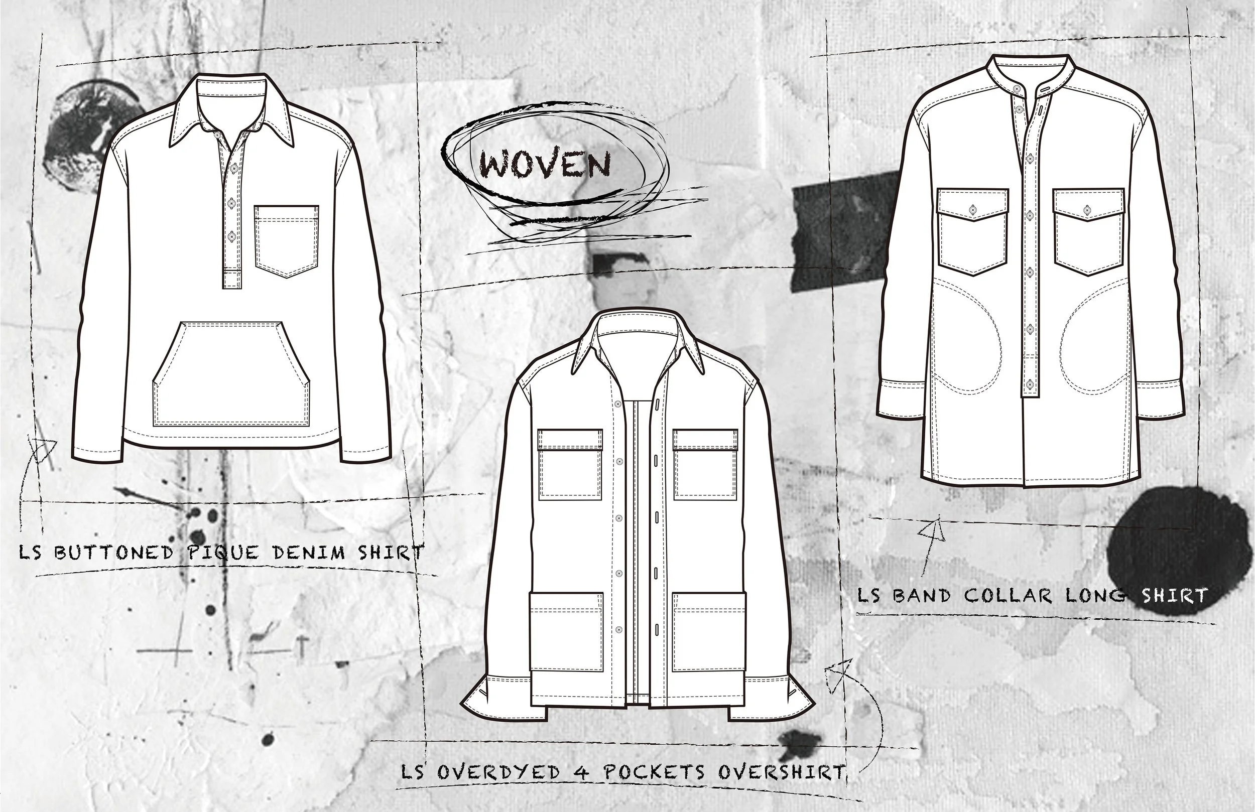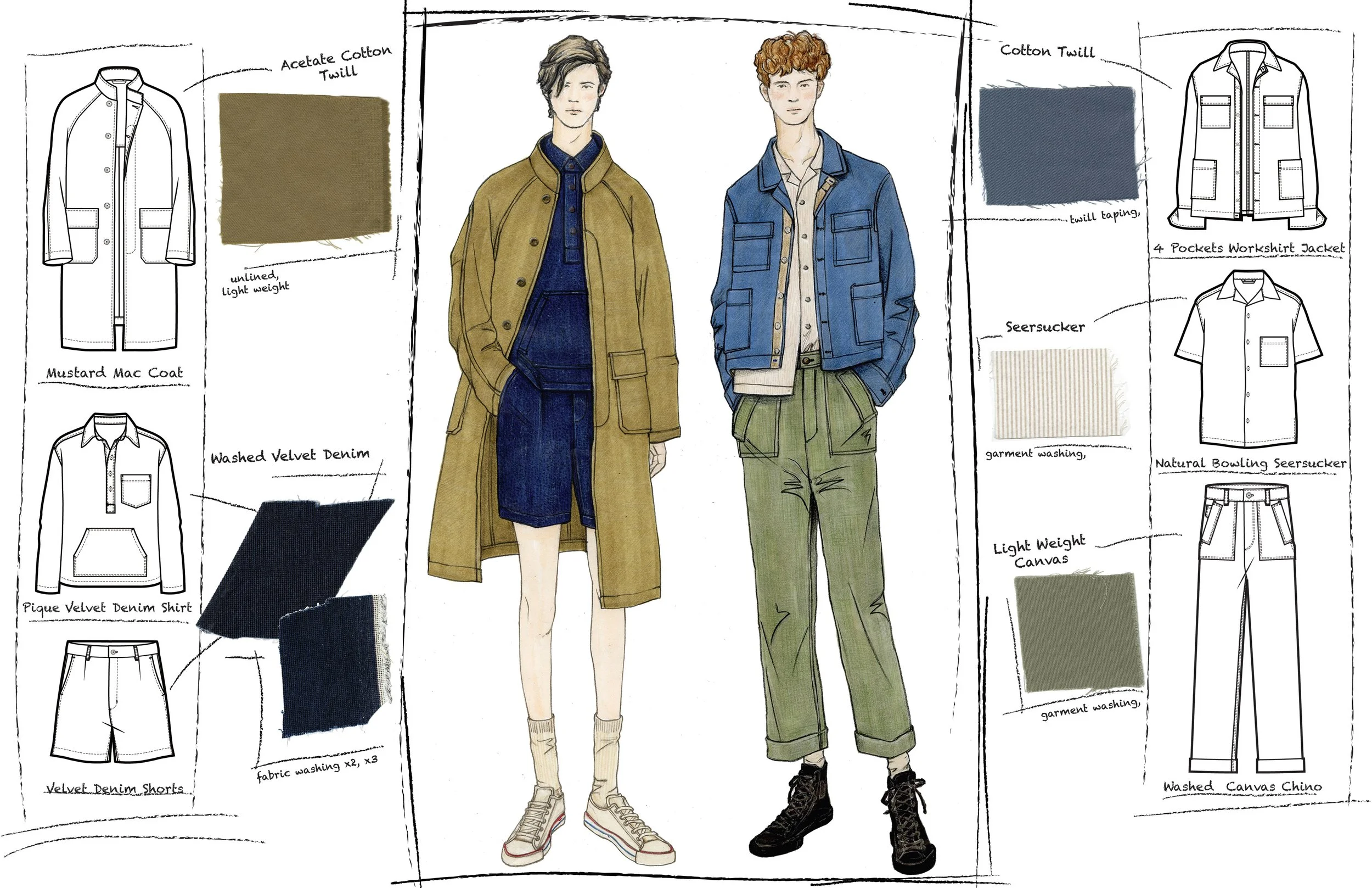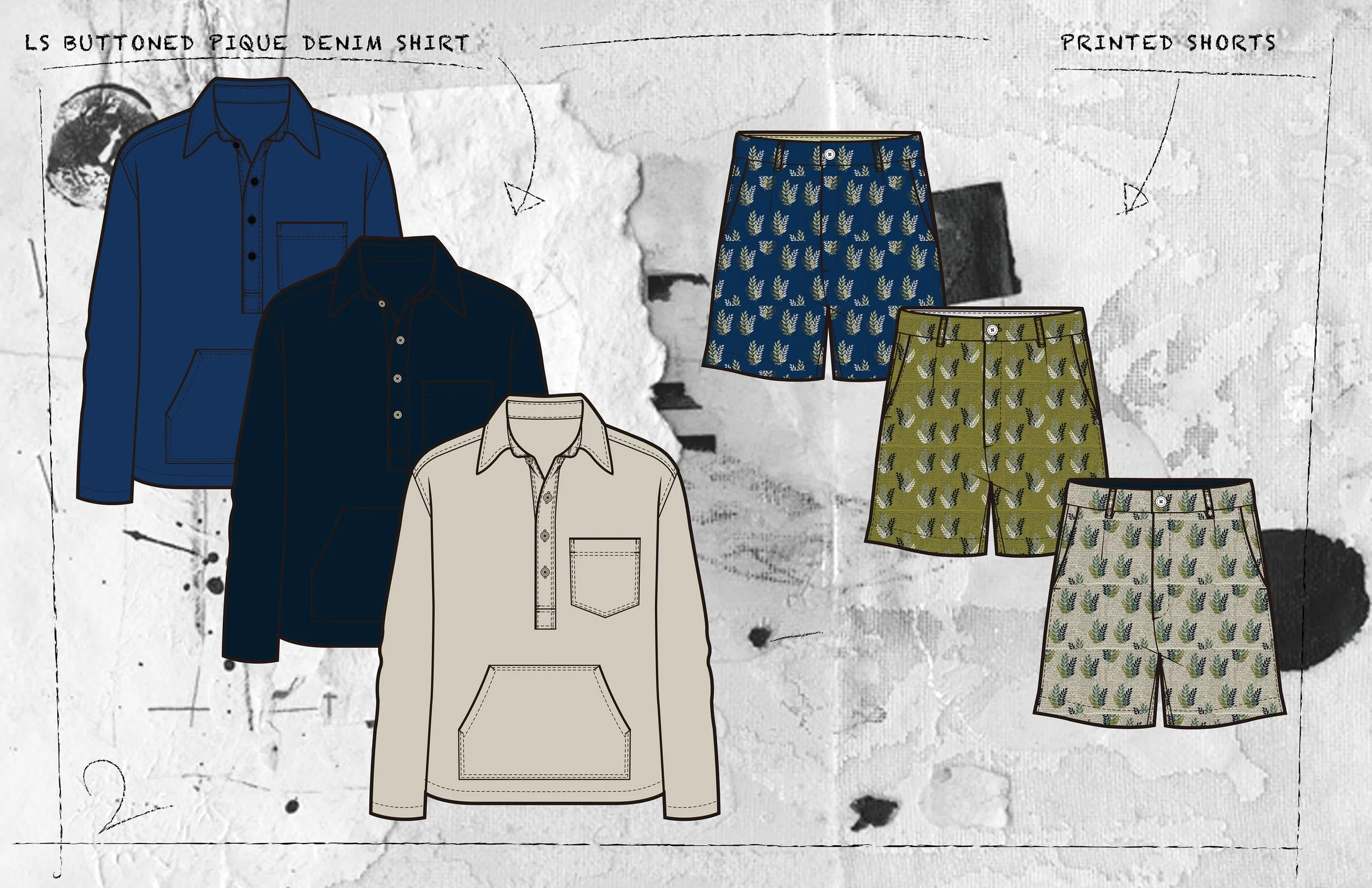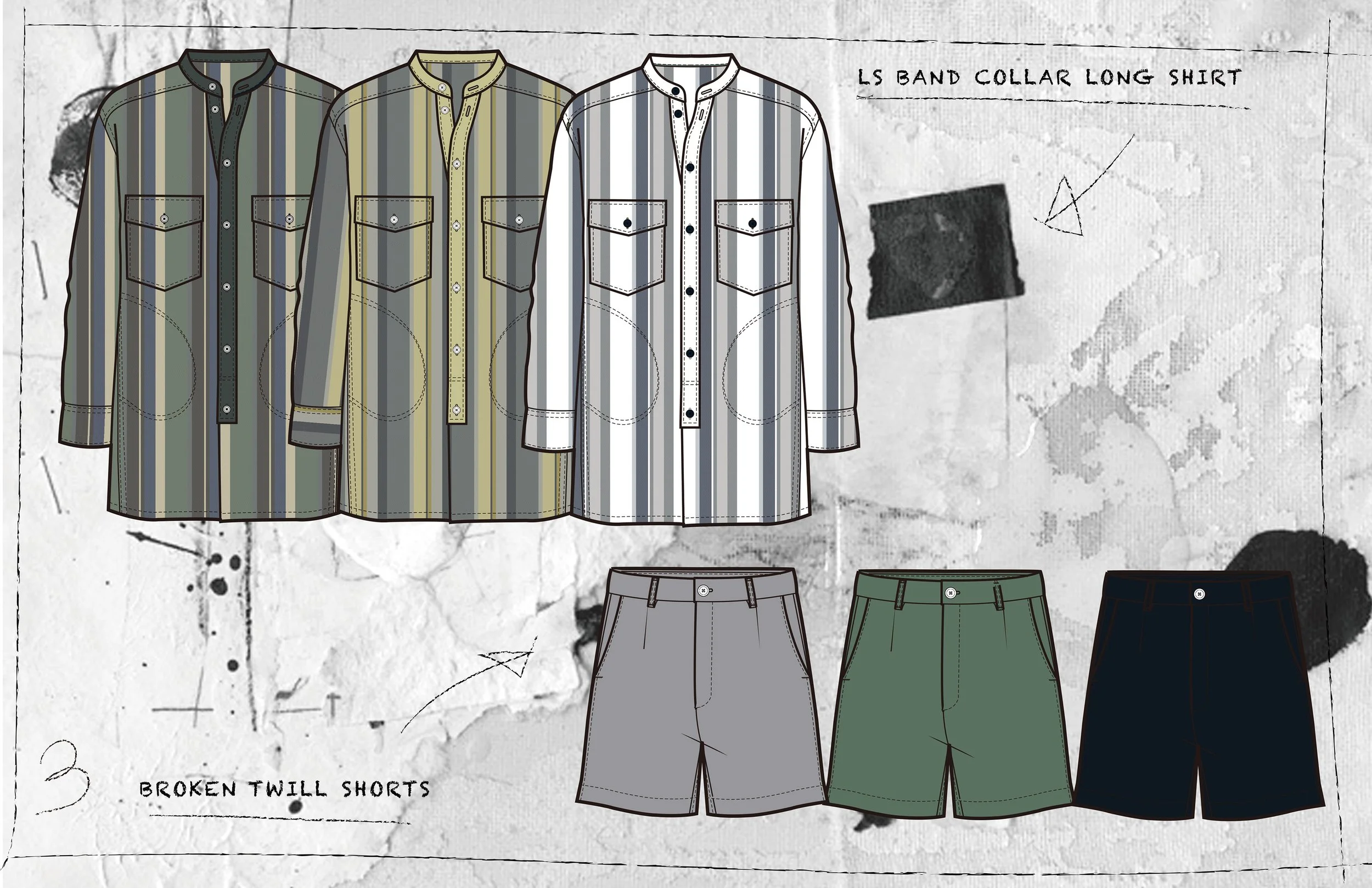 Basic items with minimal details such as t-shirt, shirt, shorts and chinos, and printed fabric such as leaf motifs, bold stripes and plaid make up the collection. Also, to emphasize the naturalness or distressing, garment-washing was done to the garments.