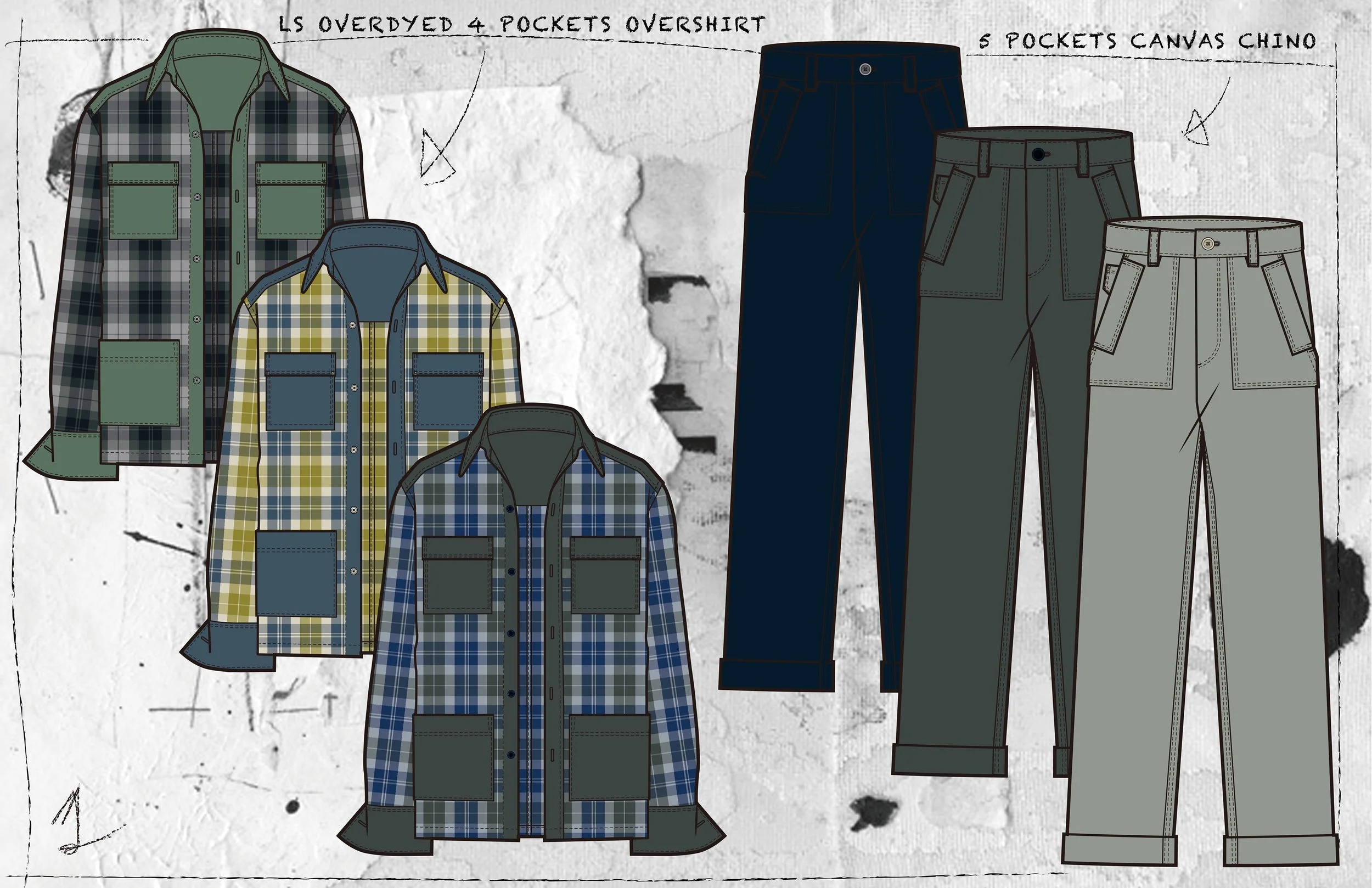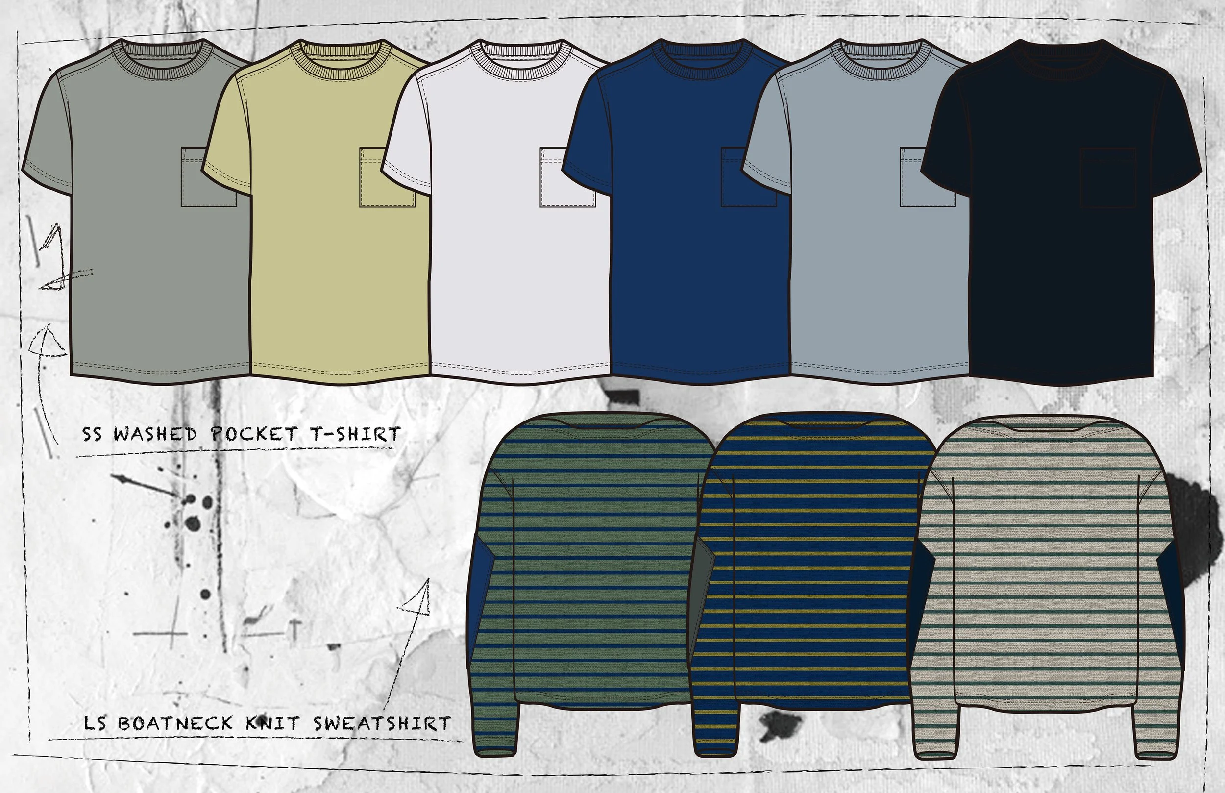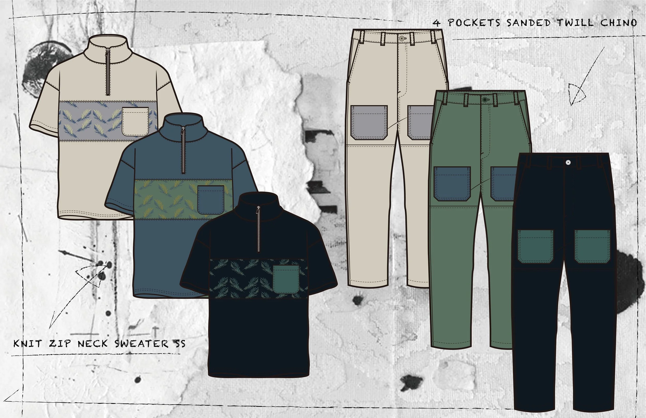 Basic items with minimal details such as t-shirt, shirt, shorts and chinos, and printed fabric such as leaf motifs, bold stripes and plaid make up the collection. Also, to emphasize the naturalness or distressing, garment-washing was done to the garments.